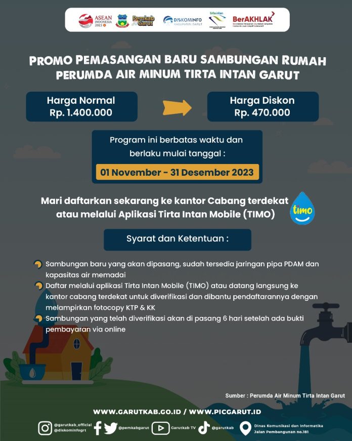 Bagi warga Garut yang berada di wilayah layanan eksisting Perumda Air Minum Tirta Intan Kabupaten Garut, dapat menikmati potongan harga istimewa. Biaya pemasangan yang biasanya Rp. 1.400.000,- kini menjadi terjangkau, hanya Rp.470.000,-