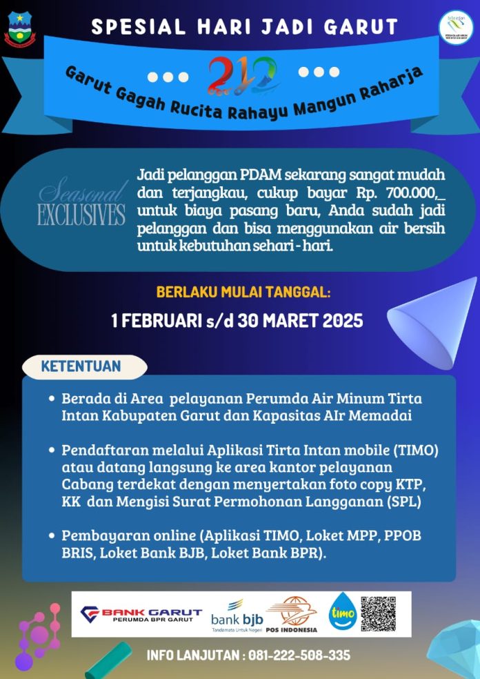 KORAN-FAKTA.ID, GARUT, 1 Februari 2025 , Dalam rangka memperingati Hari Jadi Garut ke-212 tahun 2025, Perumda Air Minum Tirta Intan Garut memberikan keringanan biaya pasang baru sambungan rumah. Biaya yang semula sebesar Rp. 1.400.000,- kini hanya sebesar Rp. 700.000,- saja.