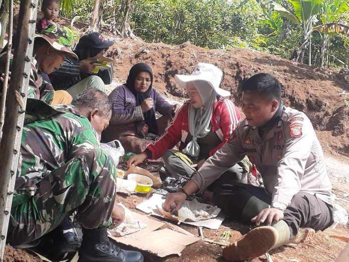 Babinsa Serka Ujang bersama Bhabinkamtibmas Bripka Herdiana bersama warganya menikmati liwet dilokasi langsung TMMD setelah istirahat siangnya.Begitu nikmatnya warga bisa merasakan kedekatan bersama anggota TNI-Polri.