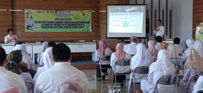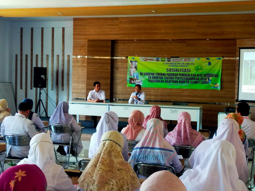 Narasumber dalam sosialisasi ini adalah dr. Zaini Abdillah, MM., CHRA., MQM., CPSp, menjelaskan bahwa proyek perubahan tersebut merupakan bagian dari Pelatihan Kepemimpinan Administrator (PKA) Tahun 2023. Proyek ini mengusung inovasi dengan tema “Peningkatan Kualitas Pengelolaan Alat Kesehatan Melalui SILAT di RSUD dr. Slamet Garut.”